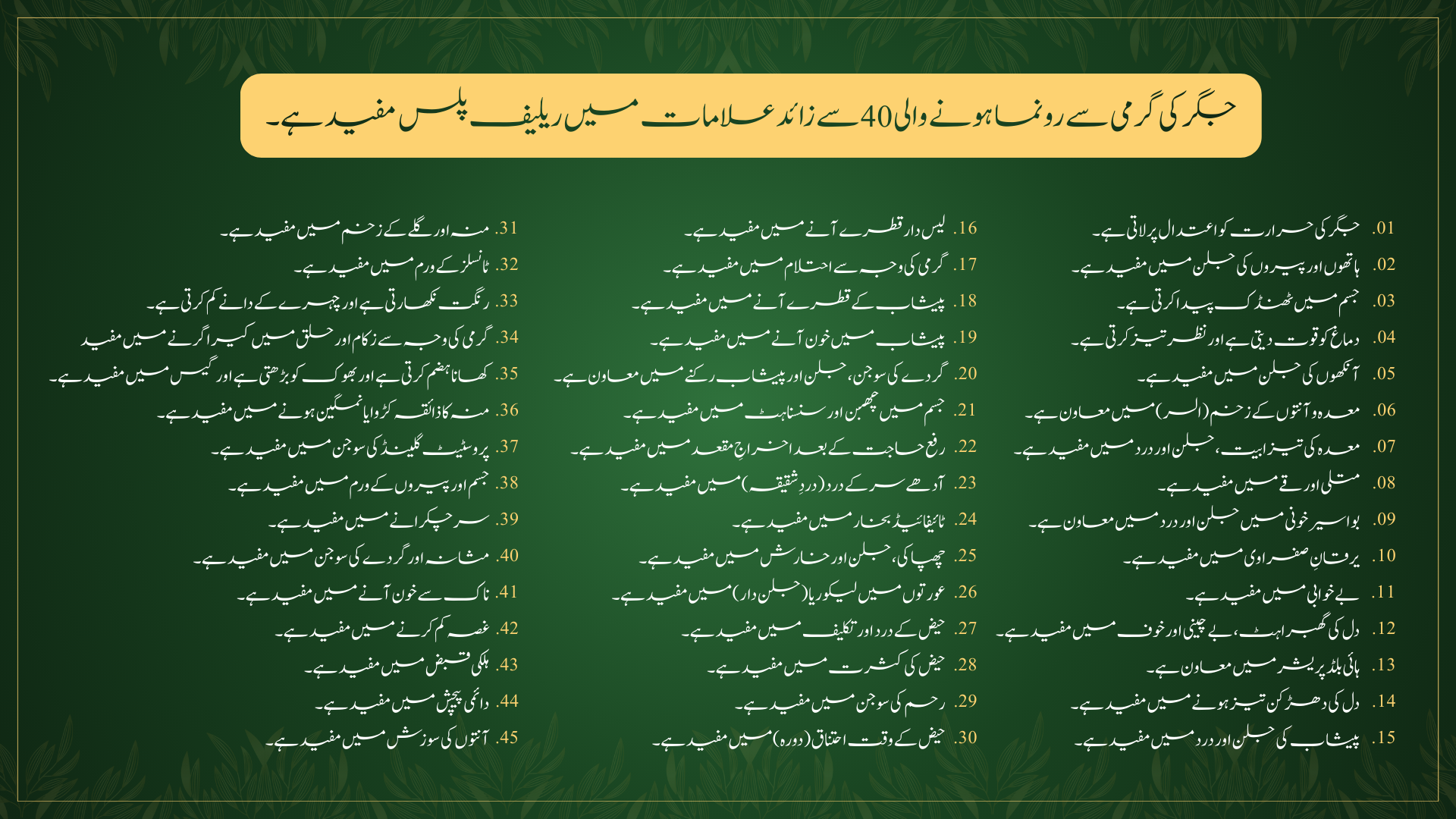 اس کے علاوہ، یہ دوا 40 سے زائد علامات میں جسم کو سکون، ٹھنڈک اور توازن فراہم کرنے کے لیے تیار کی گئی ہے۔ ریلیف پلس علامات کو دبانے کے بجائے جسم کے اندر موجود حرارت اور بگاڑ کو اعتدال پر لاتی ہے، جبکہ جگر اور اعصابی نظام کو سہارا دیتی ہے۔